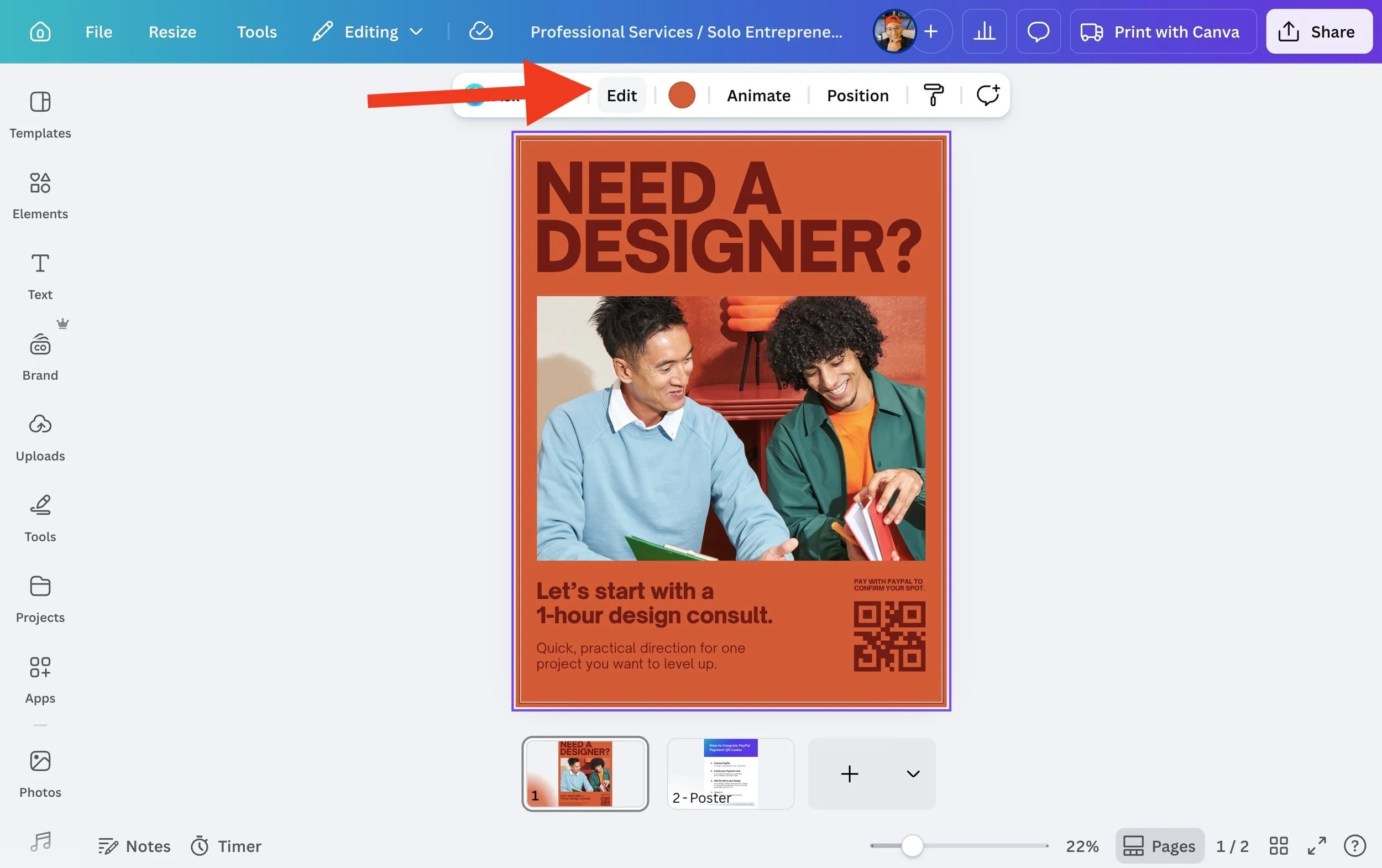 Step 2: Click "Edit" A floating toolbar will appear near the top of your canvas with options like Ask Canva, Edit, Animate, and Position. Click Edit.