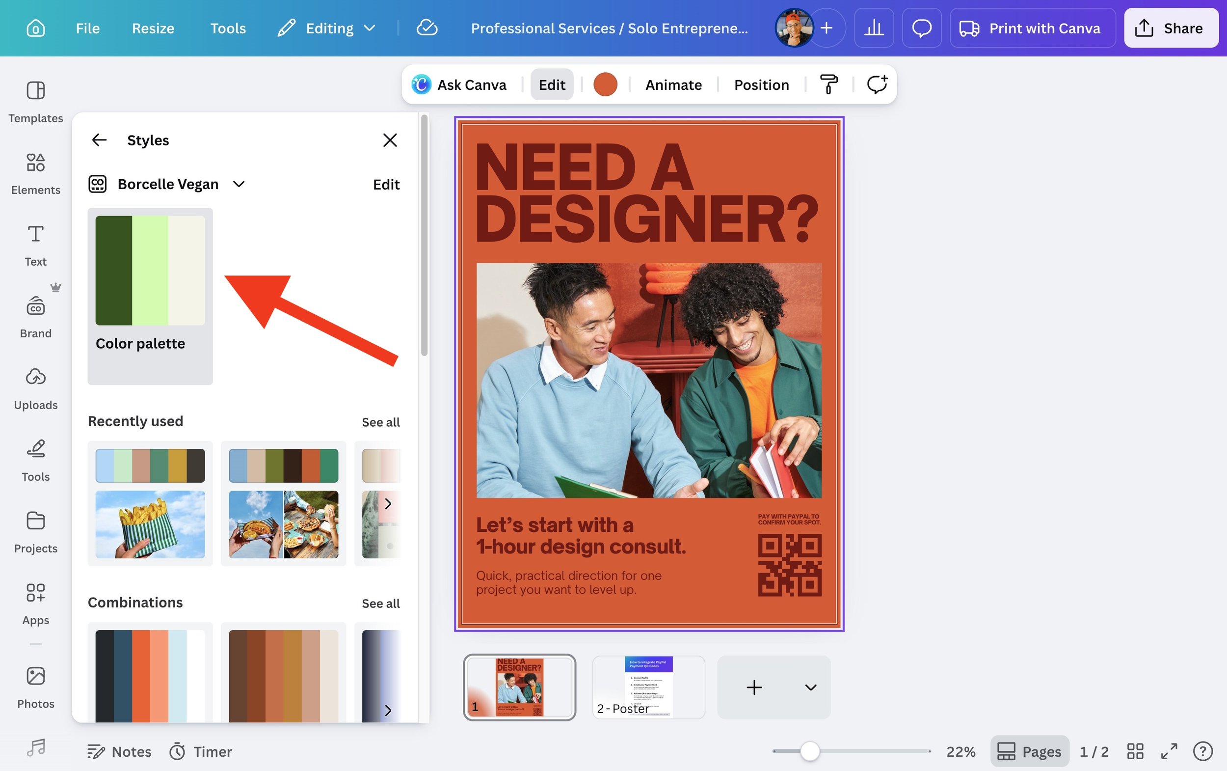 Step 4: Click "See all" and choose your style This opens the full Styles panel, where you can browse color palettes, font combinations, and recently used styles. Click any option to apply it to your design. You can also select Apply to all pages to update your entire project at once.