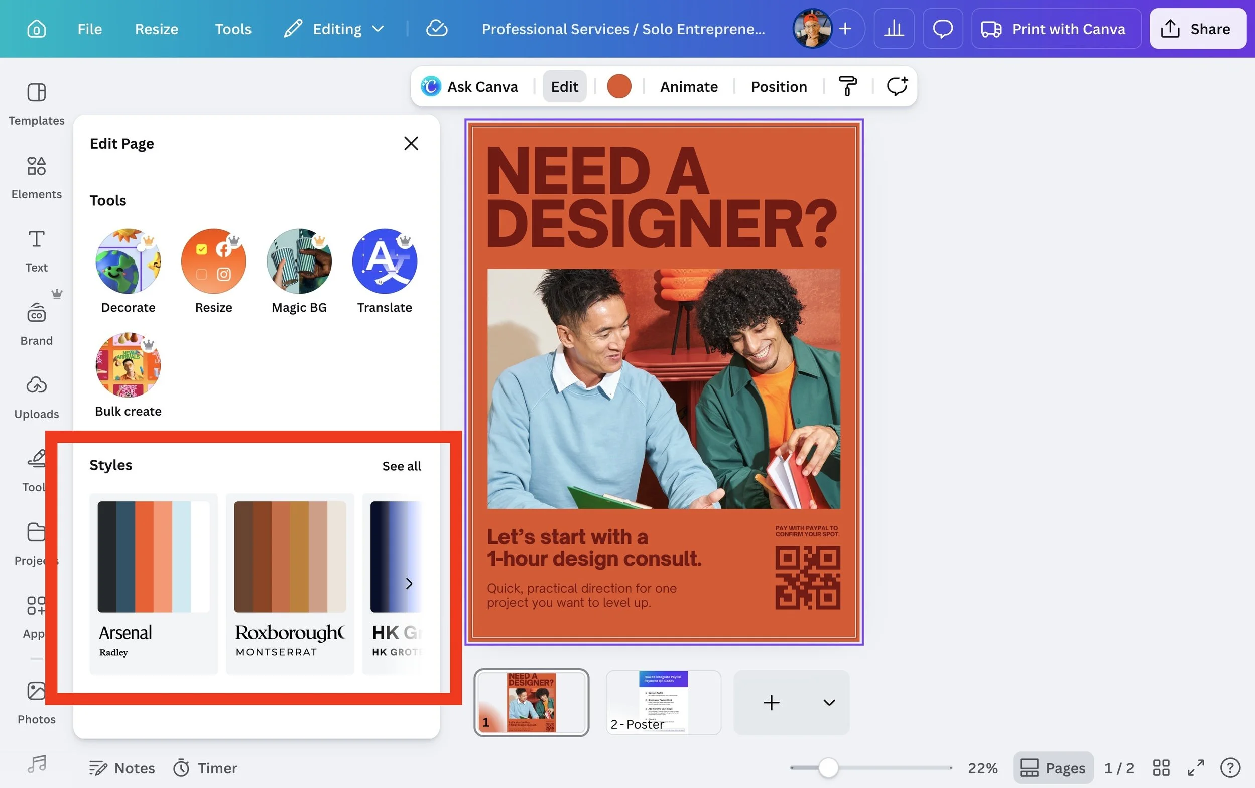 If you haven't used the Styles panel before, it's worth getting to know. It lets you instantly swap the color palette and font combination across your whole design in one click. Canva offers a library of curated pairings, and if you have a Brand Kit set up, your brand's colors and fonts will show up there too.